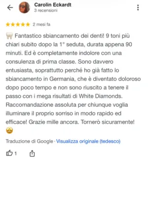 Il trattamento di White Diamonds è assolutamente sicuro e privo di effetti collaterali per la salute. Il nostro metodo è indolore e non comporta effetti indesiderati, poiché il nostro gel sbiancante contiene solo ingredienti naturali.